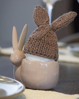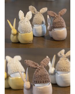 Et sjarmerende strikkemønster på eggevarmere formet som små kaniner. De strikkes med søte ører som gir et lekent og påsk...