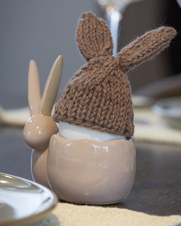 Et sjarmerende strikkemønster på eggevarmere formet som små kaniner. De strikkes med søte ører som gir et lekent og påskete uttrykk.