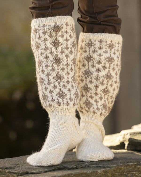Et par strikkede sokker i fine, vinterlige farger som holder føttene varme og koselige på kalde dager. Perfekte å trekke...