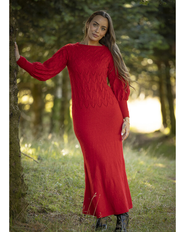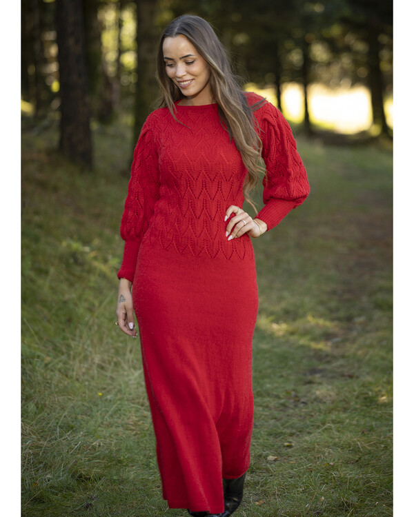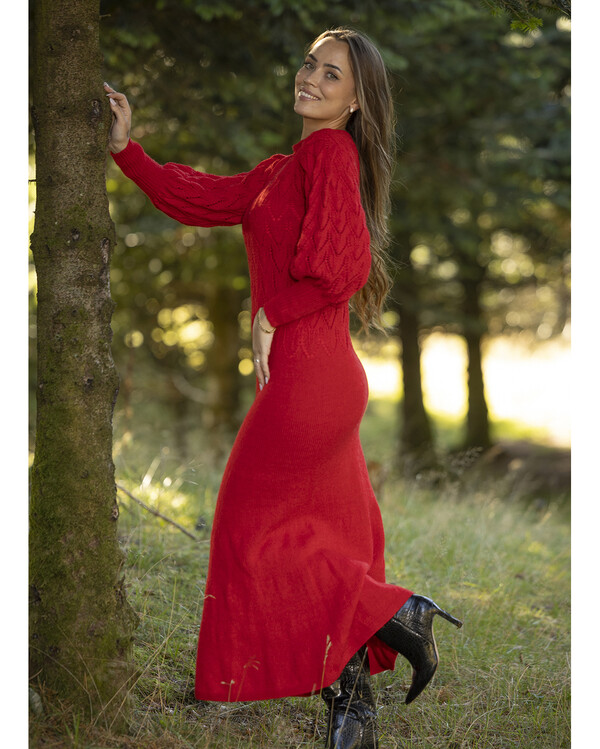 Strikk en elegant julekjole i et tidløst design som kombinerer klassisk håndverk med moderne stil. Den vakre kjolen har et dekorativt hullmønster og puffede ermer som gir den et feminint og festlig uttrykk.