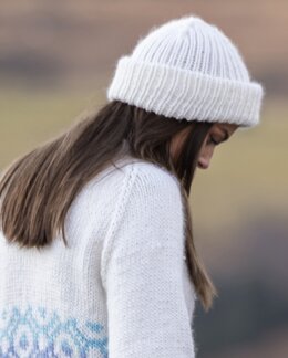 En stilren, strikket lue med bred oppbrettet kant og et uttrykk som kombinerer enkelhet og varme. Den ribbestrikkede str...