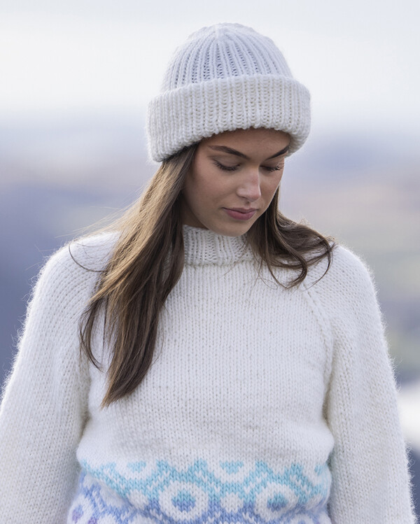En stilren, strikket lue med bred oppbrettet kant og et uttrykk som kombinerer enkelhet og varme.