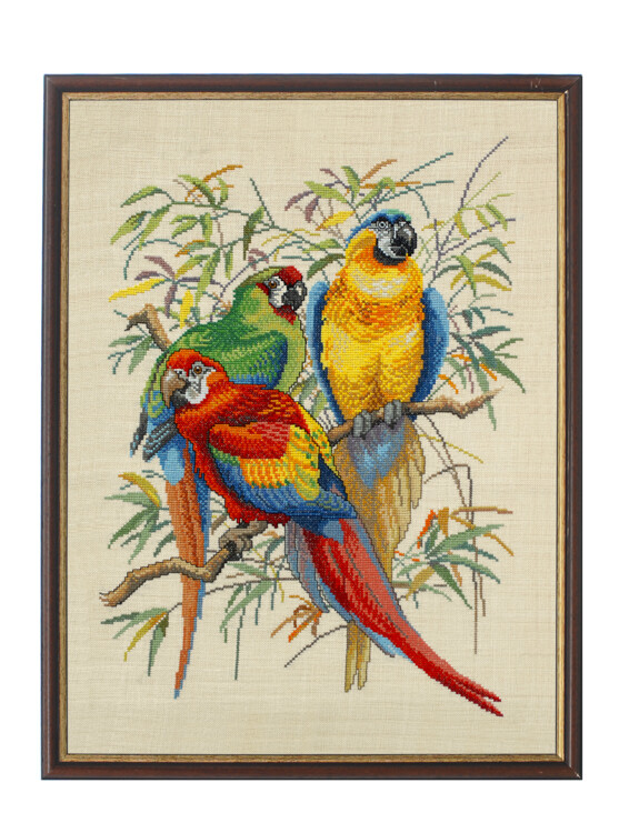 Broderes med moulinegarn i utregnede kors- og attersting på hvit aida 4,4 ruter/cm eller bleket lin 8 tr/cm. Størrelse 45x60 cm. Rammen selges ikke.