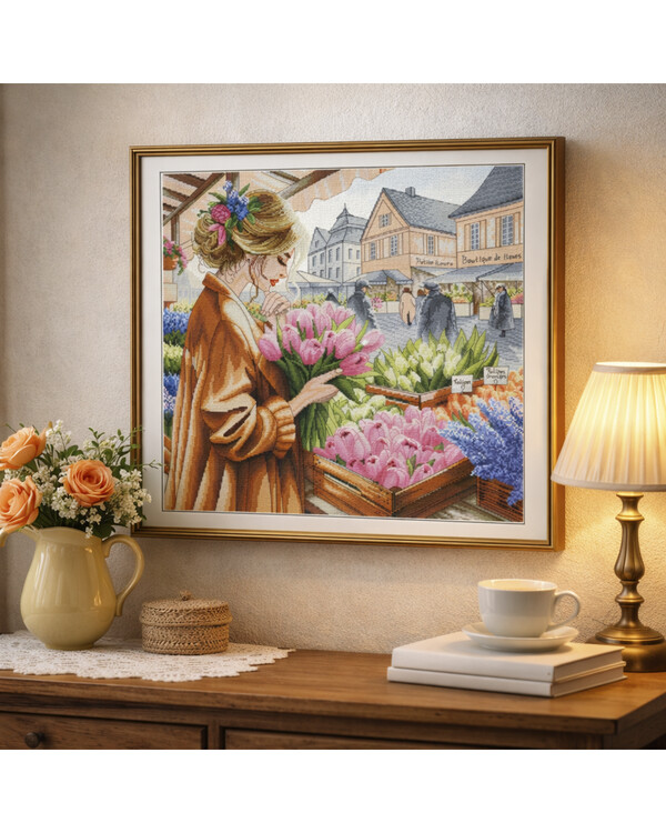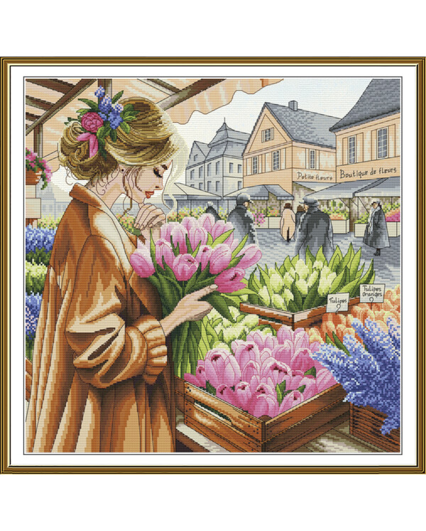 Et sjarmerende korsstingsmotiv fra et livlig blomstermarked der en kvinne velger tulipaner blant fargerike blomsterboder.
