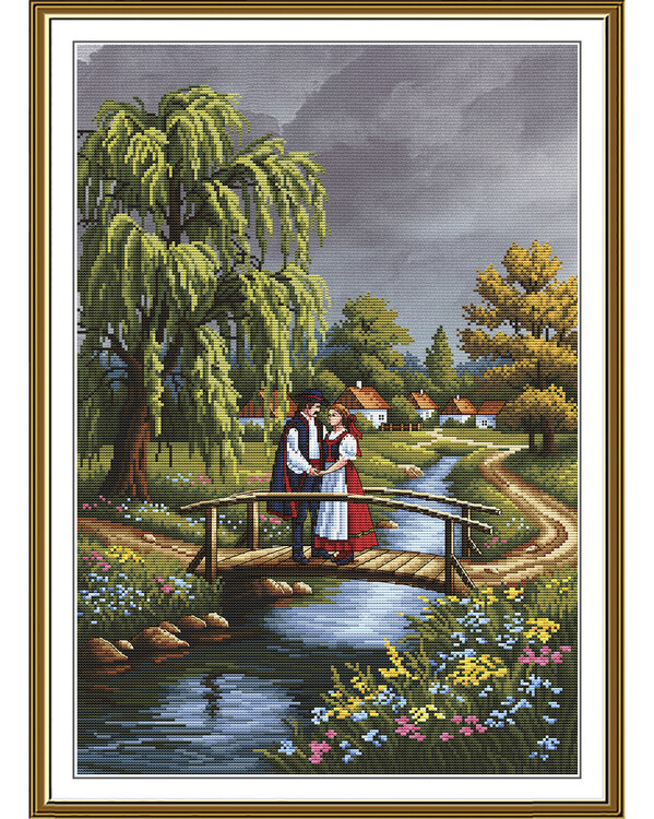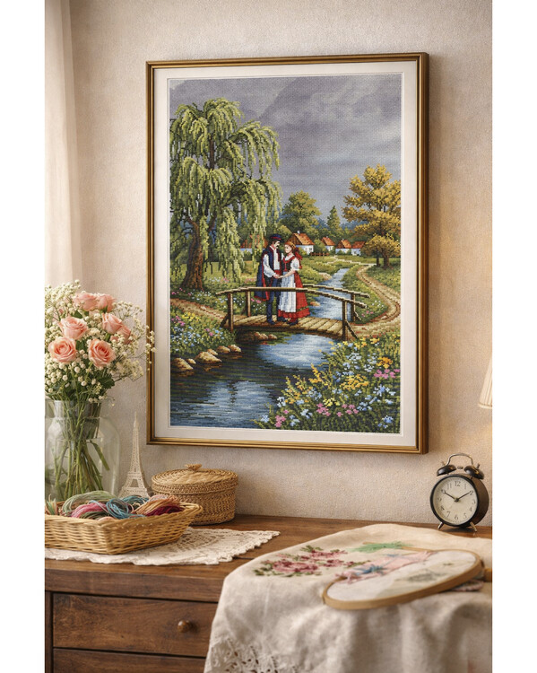 Et vakkert broderibilde for deg som liker klassiske naturmotiver og romantiske landskap.