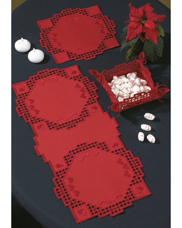Broderes med perlegarn i hardangersøm på rød hardangervev, 9 tråder/cm. Størrelse duk ca 23x50 cm.