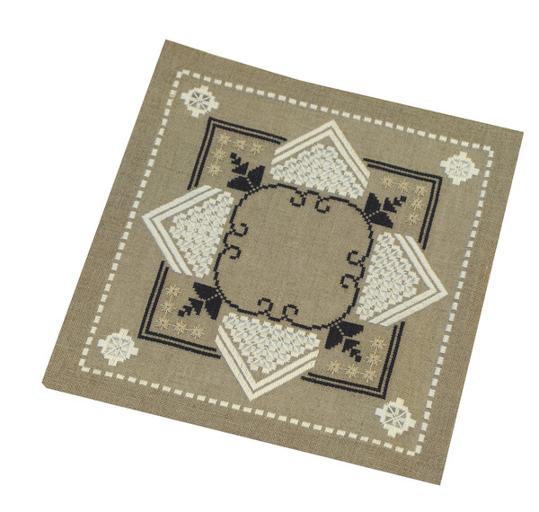Broderes med perle- og moulinégarn i hardanger-, strekk- og plattsøm samt korssting på linvev 10 tråder/cm. Størrelse 26x26 cm.