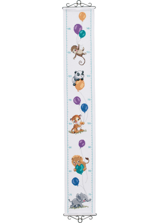 Følg høyden med dette søte måleveggteppet der ulike figurer flyr fram med hver sin ballong. Broderes med moulinégarn i u...