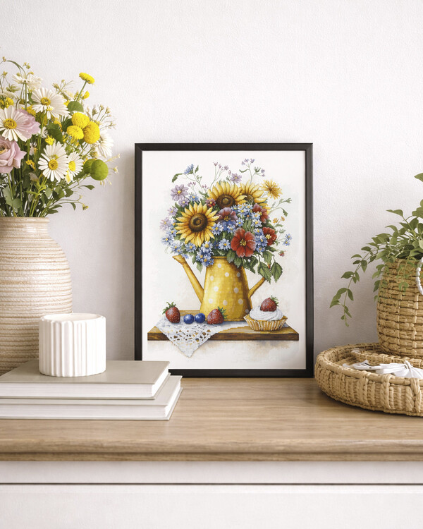 Et livlig broderimotiv med solsikker, blå forglemmegei og valmuer i en gul prikkete kanne – perfekt for å spre glede og farger i hjemmet.