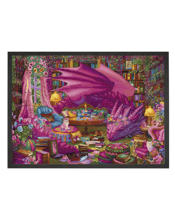 Lag et eventyrlig kunstverk med denne magiske broderipakken i korssting. Motivet viser et detaljrikt fantasilandskap der en mektig drage hviler i et fargesprakende rom fylt med bøker, blomster og glødende lys.