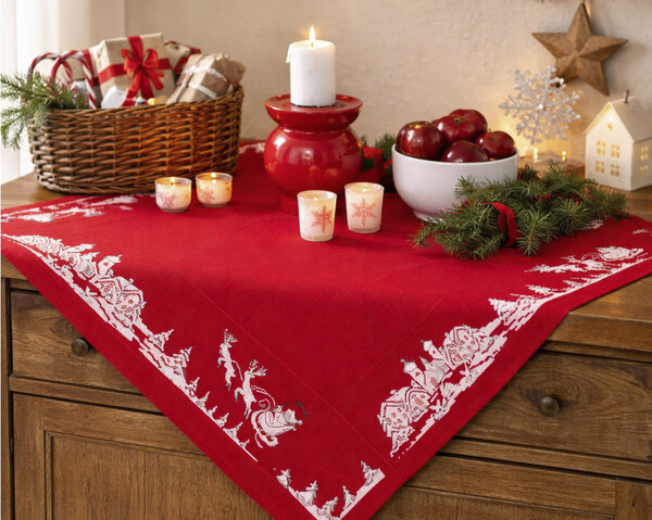 Broderes med moulinégarn i utregnede kors- og attersting på rød bomullsvev med innvevet aidabord, 4,5 ruter/cm. Ferdigsydde kanter. Størrelse ca 90x90 cm.