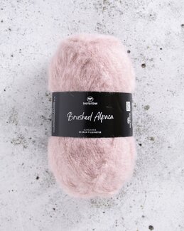 Brushed Alpaca er et fluffy og luksuriøst garn med 91 % alpakka og 9 % nylon. Den børstede kvaliteten gir en myk, luftig og lett følelse – perfekt til trendy plagg strikket på grove pinner.